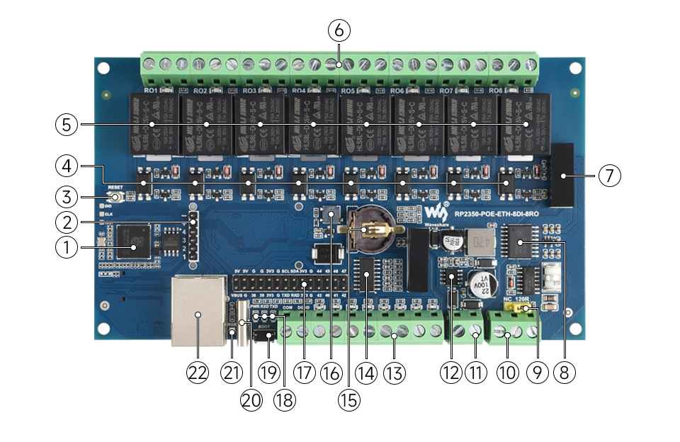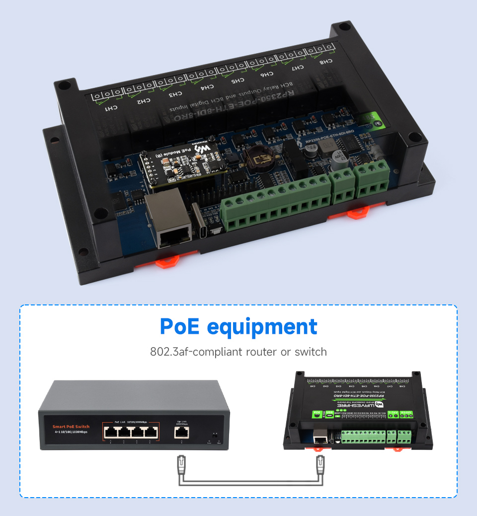 WAVE-32451, PoE Ethernet Port Industrial 8-Channel RP2350 Relay Module, Based On RP2350 Dual-core & Dual-architecture Microcontroller, Supports Digital Input