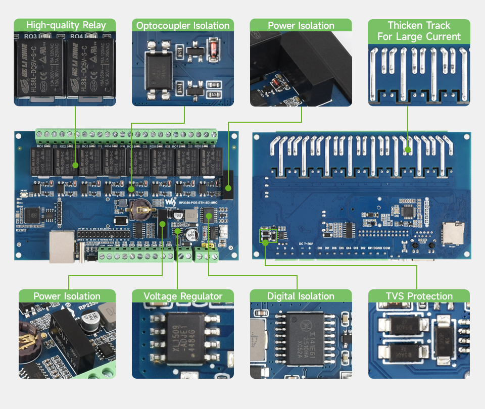 Built-in protection circuits such as power isolation and optocoupler isolation, Safe & Stable & Reliable