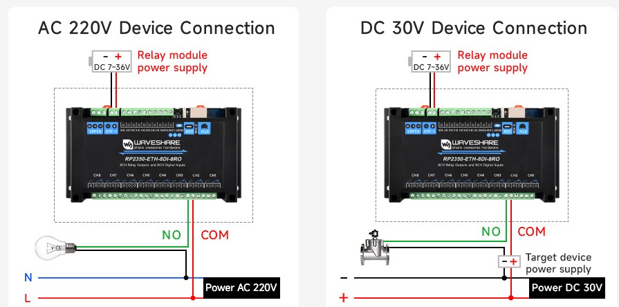 Onboard 8-ch relays and 8-ch digital inputs, Contact rating of the onboard relay up to 10A 250V AC / 30V DC, Directly controlling 220VAC home appliances, or devices below 30V DC