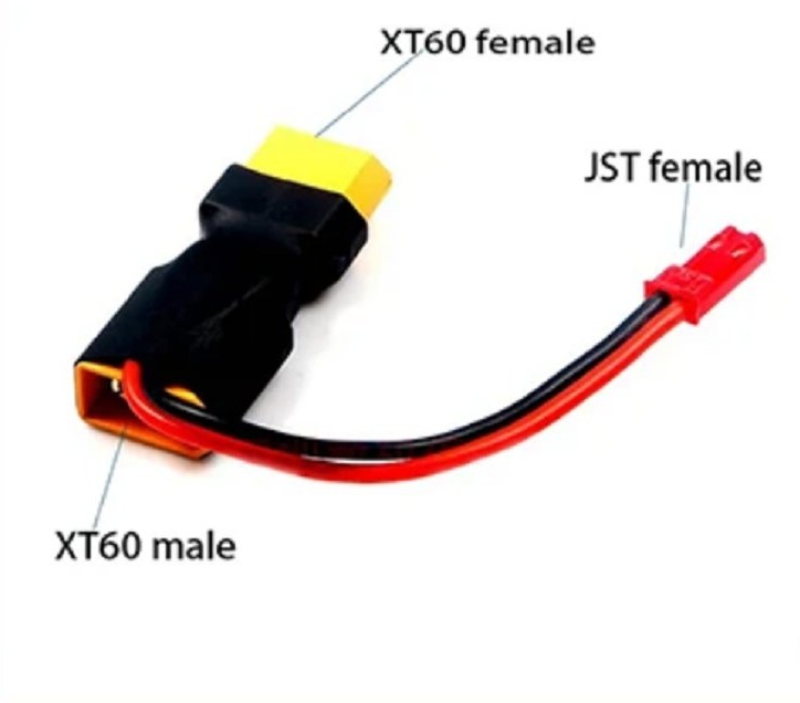 This adapter lets you power low-current accessories from a battery pack with XT60 connectors. The cable converts to a JST-RCY female connector, the common 2-pin red plug used in RC models.