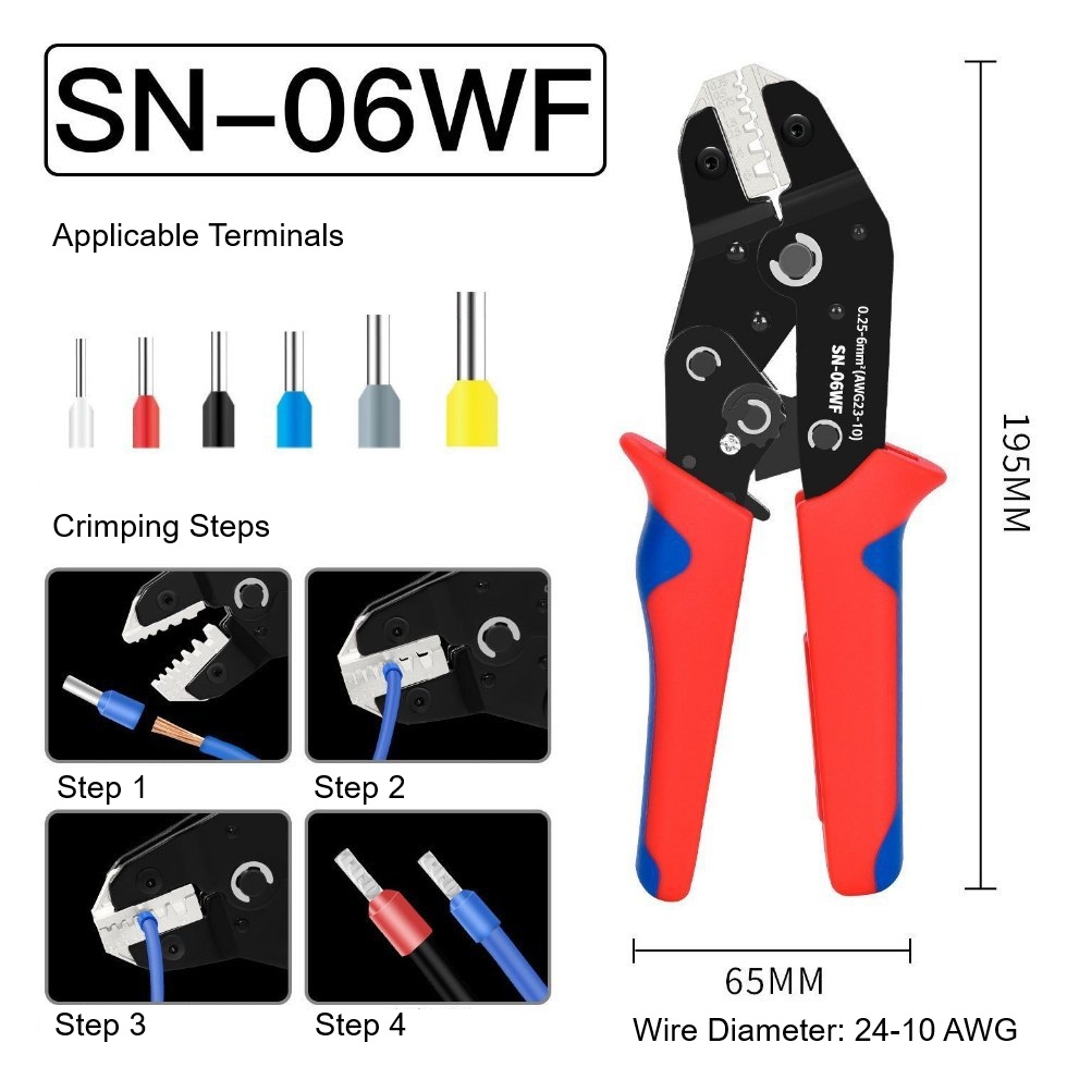 This is a Insulated and Non-Insulated Ferrules Crimper SN-06WF for 0.25-6mm² (AWG 24-10) Terminals.