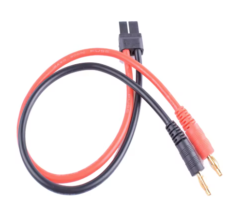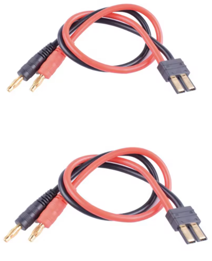 Adapter cable for connecting TRX-equipped batteries to RC chargers with 4mm banana plug outputs. Built with durable 14AWG silicone wire and gold-plated connectors for efficient, low-resistance current transfer. Ideal for Traxxas LiPo and NiMH battery charging setups.