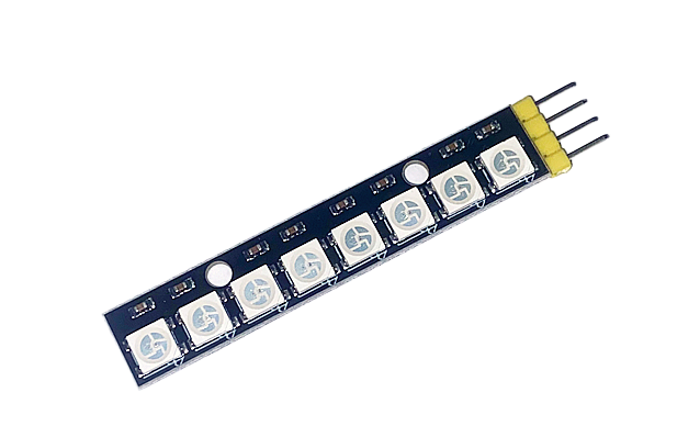 This is a chainable board equipped with 8 5050 WS2812 RGB LEDs in the smallest possible size with pre-soldered header. The WS2812s are each addressable as the driver chip is located inside the LED. Each pixel has ~18mA constant current drive so the color will be very consistent even if the voltage varies, and requires 5V.