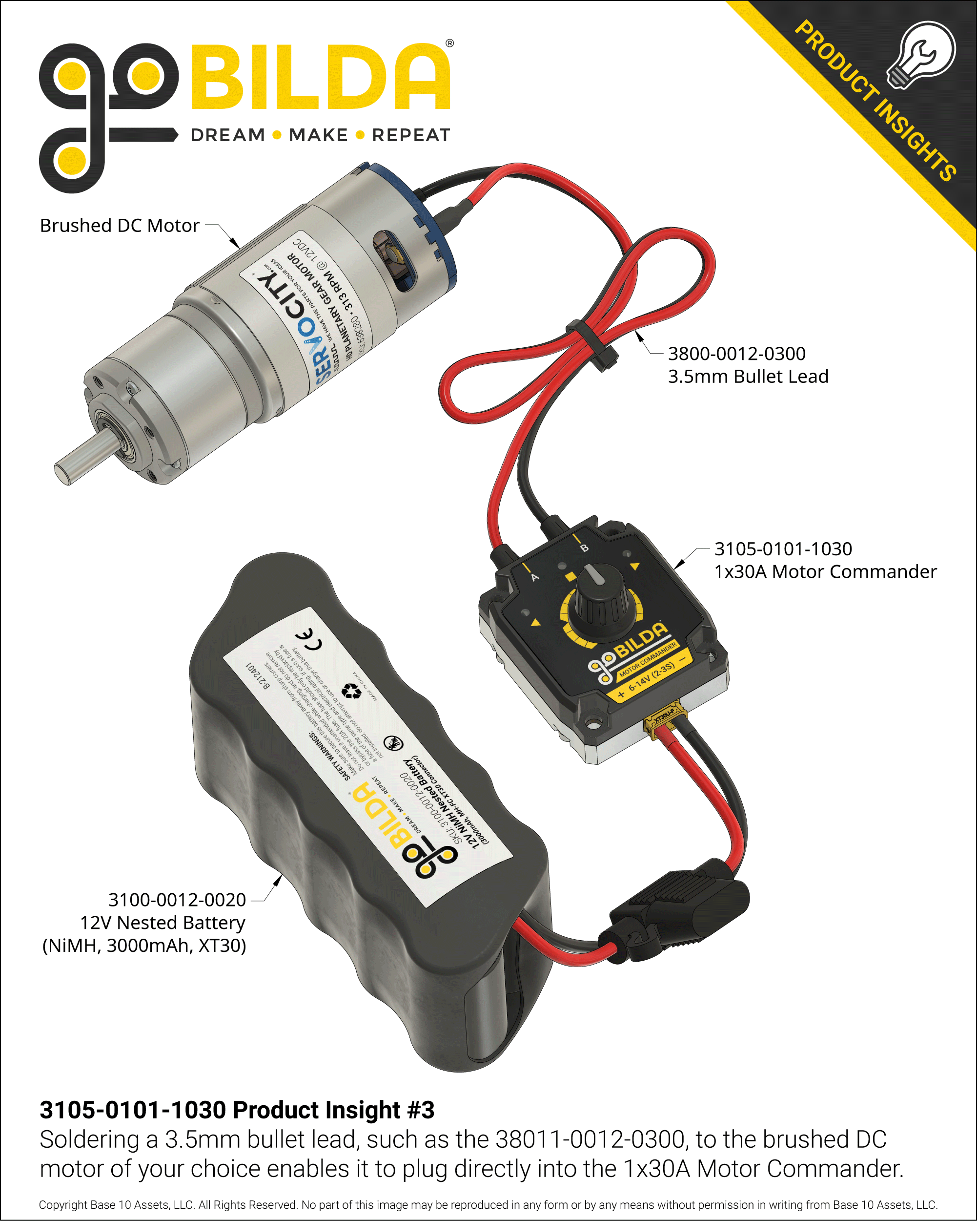 Supply 6–14V to the XT30 connector. The motor will receive this voltage through the Commander’s 3.5mm connectors labeled “A” and “B.”
