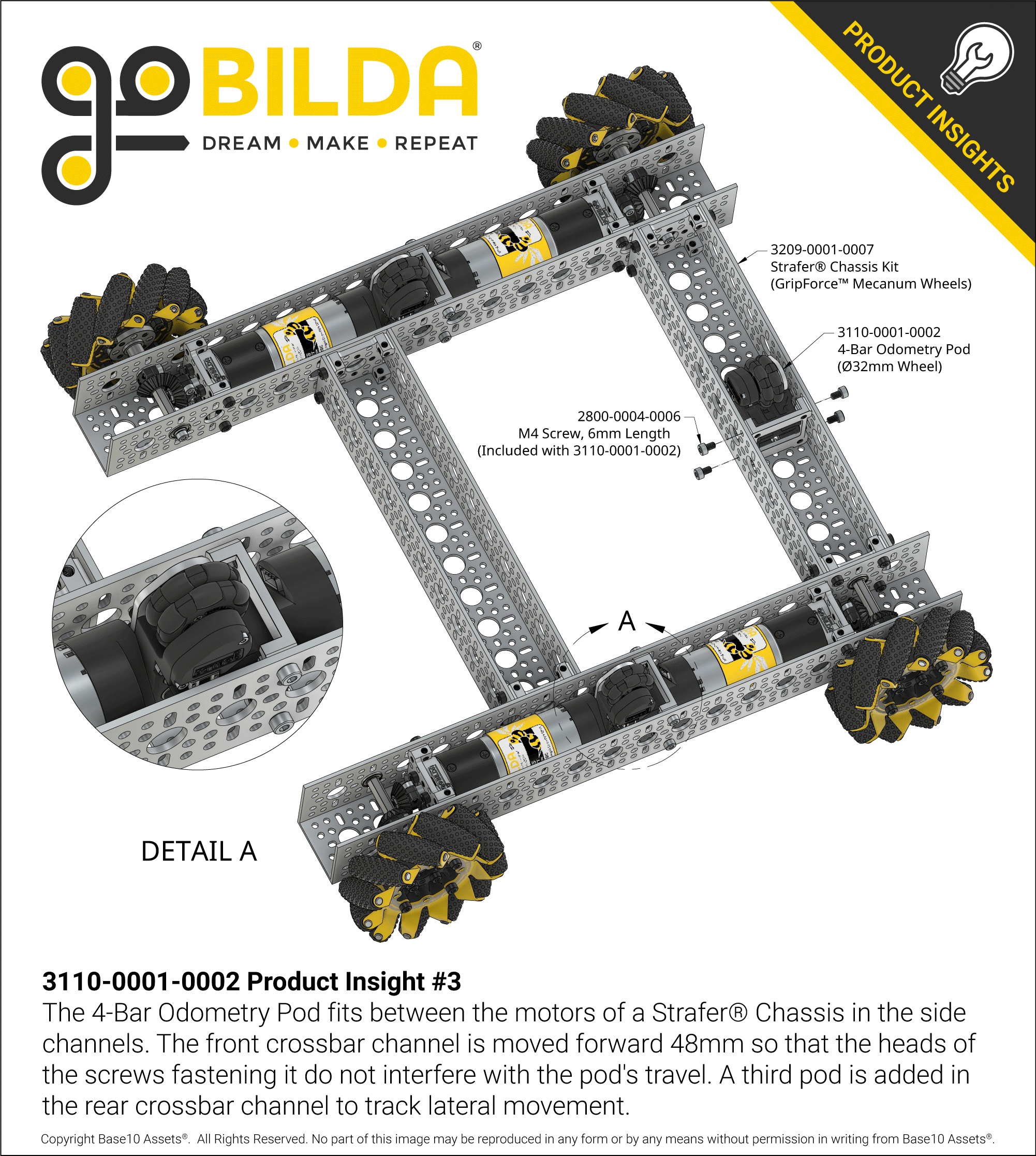 Equipping an odometry pod to each side of a skid-steer chassis is a perfect way to track the chassis’ overall movement (which is facilitated by the combined input of its two sides). For a chassis with more complex maneuverability, such as a mecanum chassis, a third odometry pod is useful for tracking the additional degree of freedom.