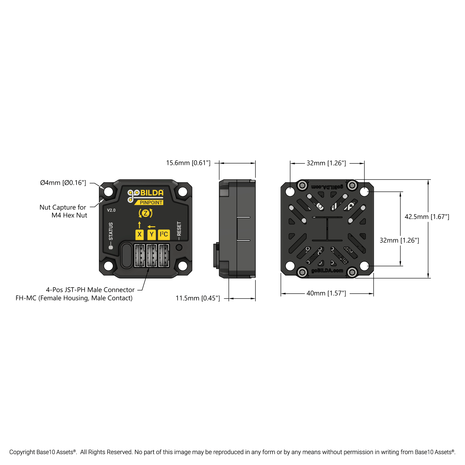 Refresh Rate: The powerful internal processor allows stunningly fast processing. Instead of estimating your position every 0.01 to 0.03 seconds, the Pinpoint estimates your robot’s position every 0.00065 seconds. To put it another way: while most FTC dead-wheel systems run at 100-300hz, the Pinpoint runs at 1,500hz. The minimization of travel distance between readings drastically cuts down on error and allows the Pinpoint’s Constant Velocity Pose Estimation algorithm to really shine. It also means you can push your robot faster than ever!