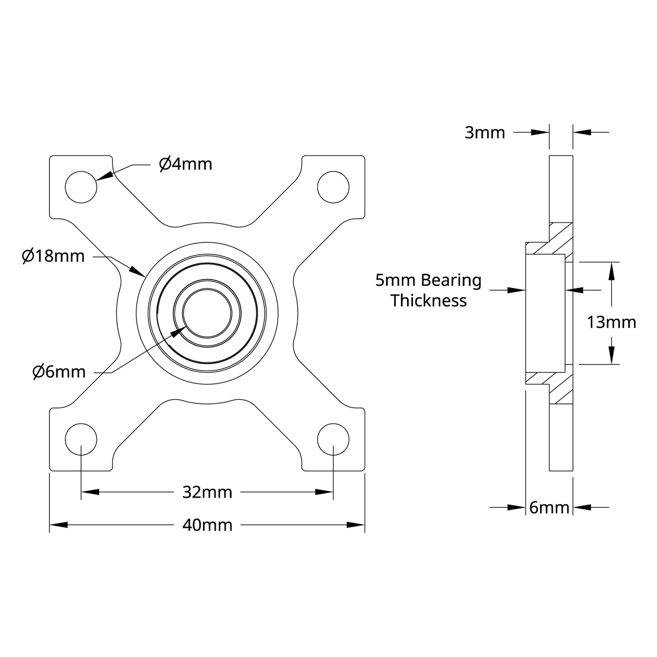 1603-0032-0006, 6mm Bore Face Thru-Hole Pillow Block (32mm x 32mm Mounting Pattern)