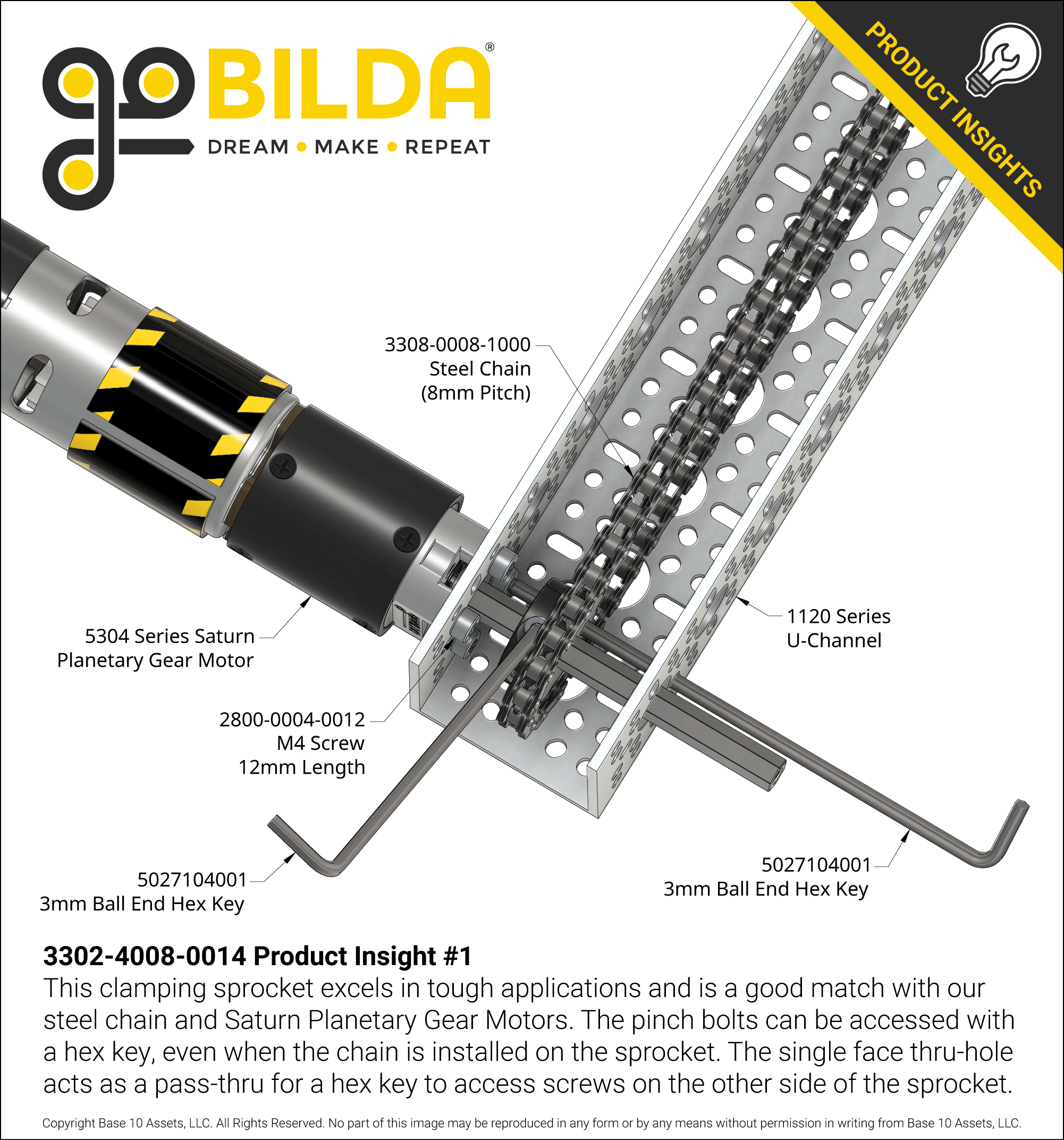 Beyond its clamping function’s excellent performance in high-torque applications, the sprocket is balanced for rapid rotation in high-speed applications. The steel construction provides excellent strength and wear resistance, making it suitable for heavy-duty use. A single hole on the goBILDA® 16mm square pattern runs through the sprocket to allow access to M4 screws that would otherwise be difficult to reach.