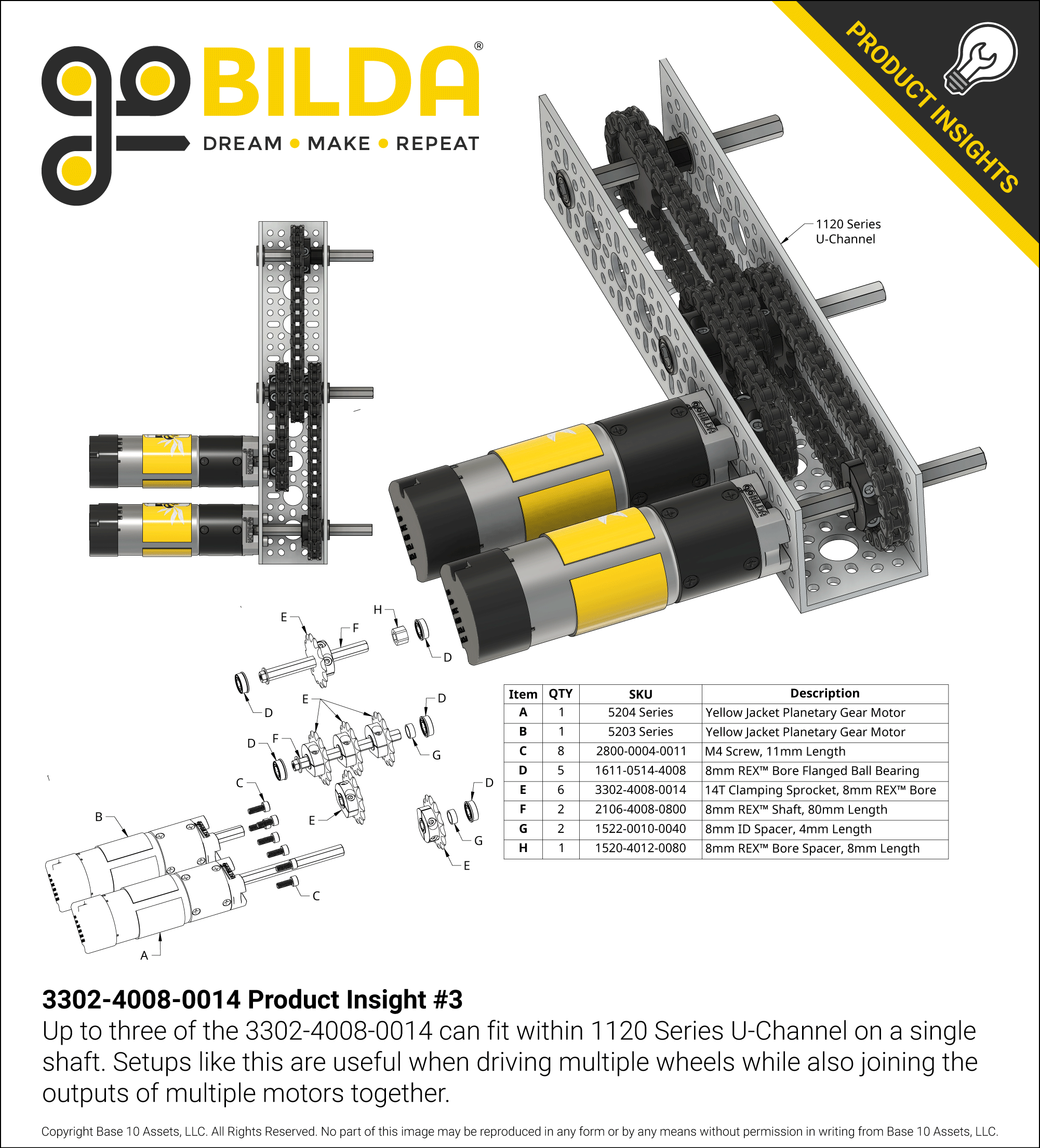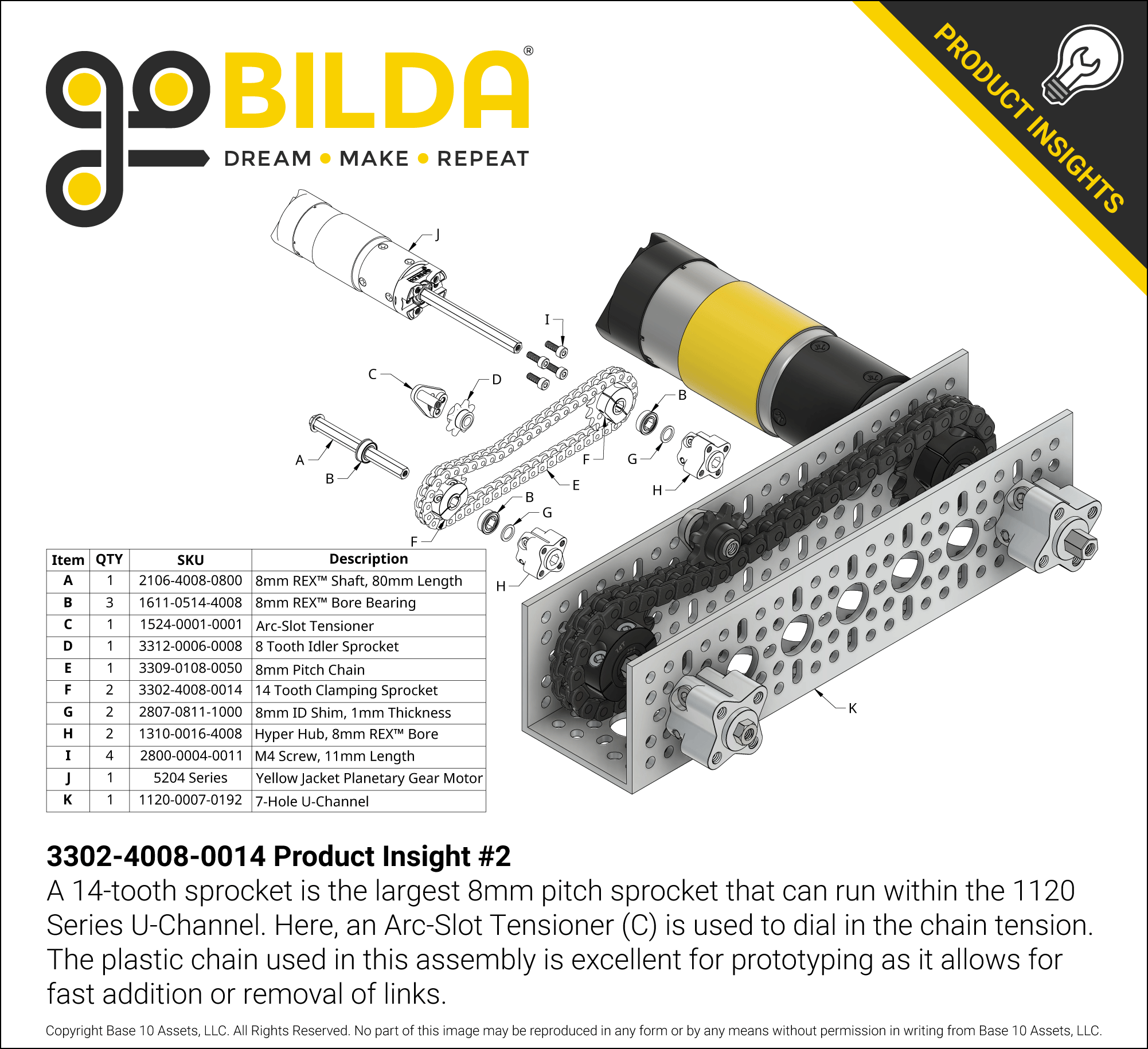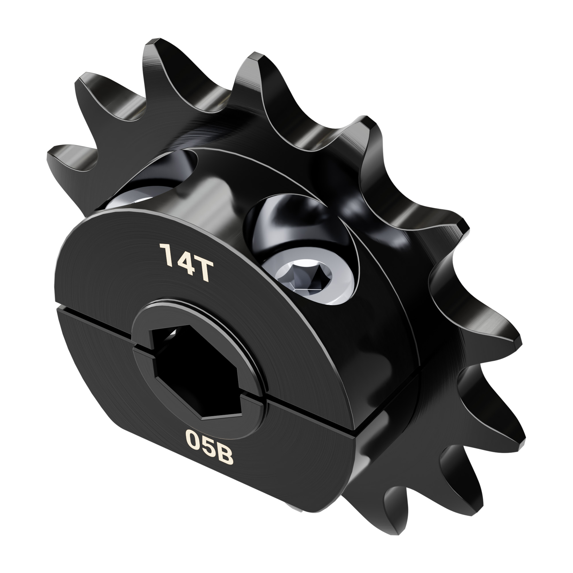This 14 tooth sprocket is designed to clamp onto an 8mm REX™ shaft and integrate with 8mm pitch (05B) chain. Its two-piece clamping mechanism is a robust, non-marring solution for fastening to a shaft.