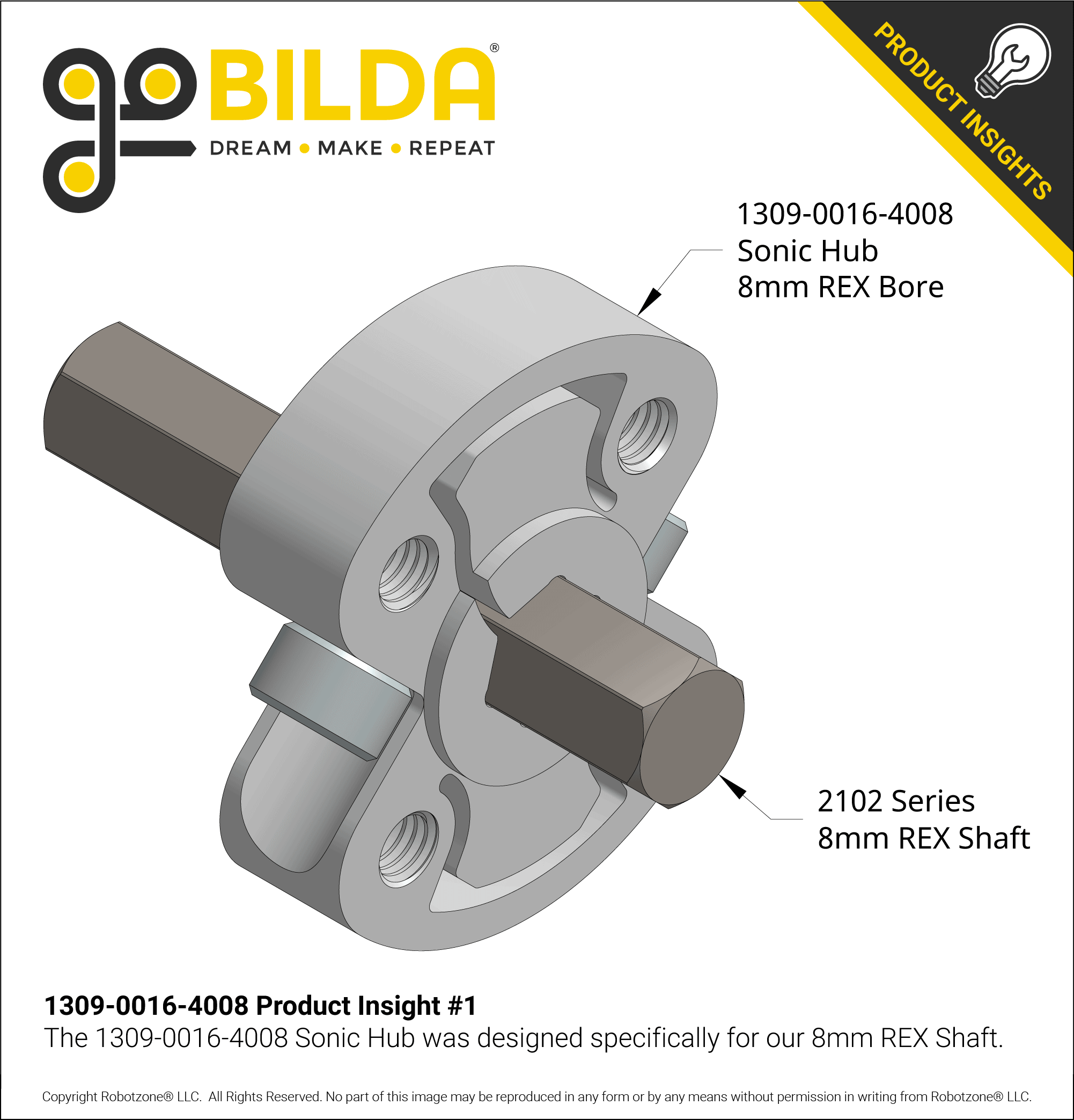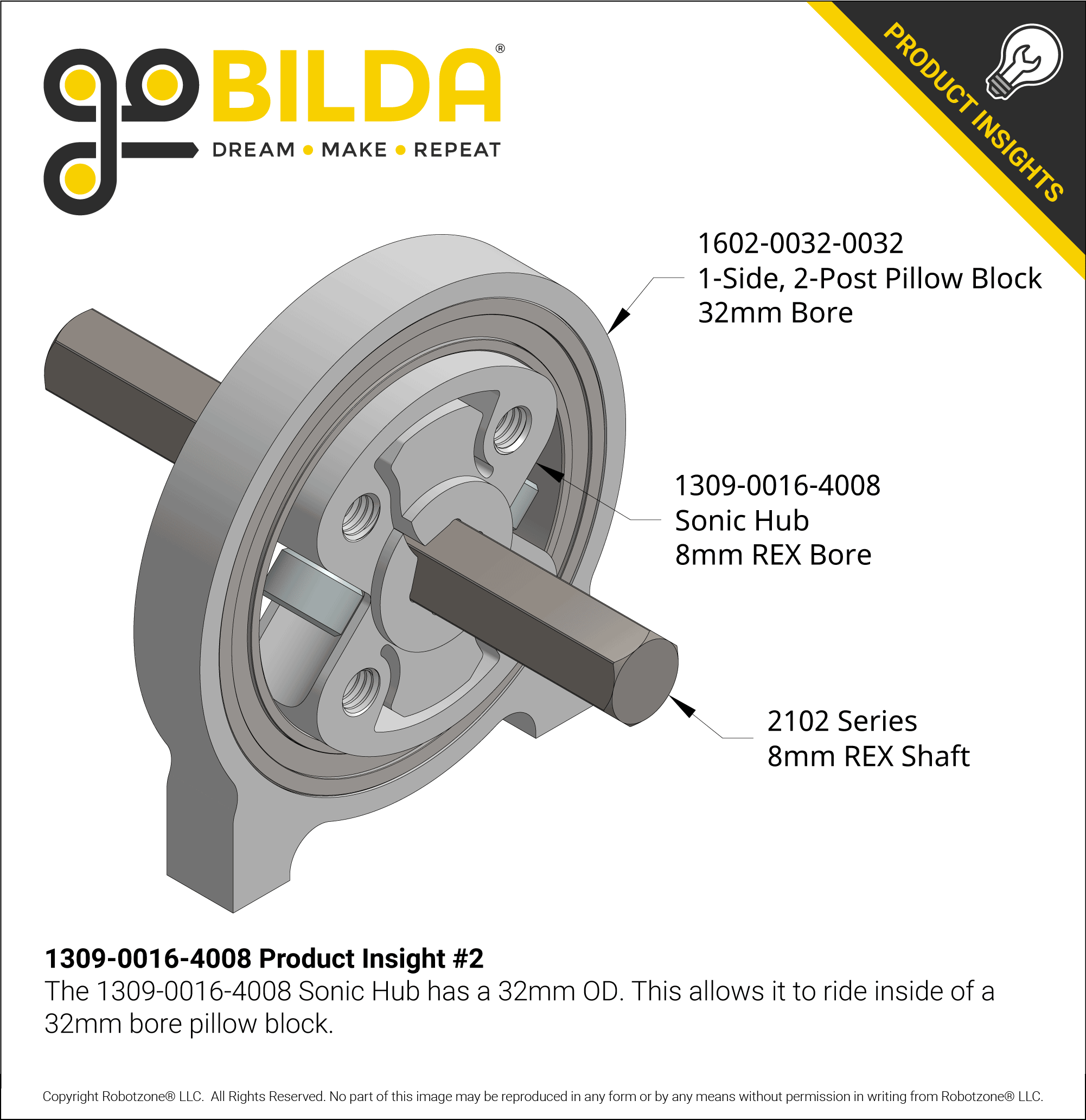 This hub has an 8mm REX™ bore to match our 8mm REX™ shafting. The hex profile creates a positive drive that can handle heavy torque loads without concern of rounding out. The Sonic style hub is perfectly balanced for high-speed applications. The unique design conforms tightly around a shaft when tightened, without distorting the threaded holes on the goBILDA 16mm pattern. The outer profile is 32mm so that it can be run in a bearing to isolate radial loads, or even clamped around.