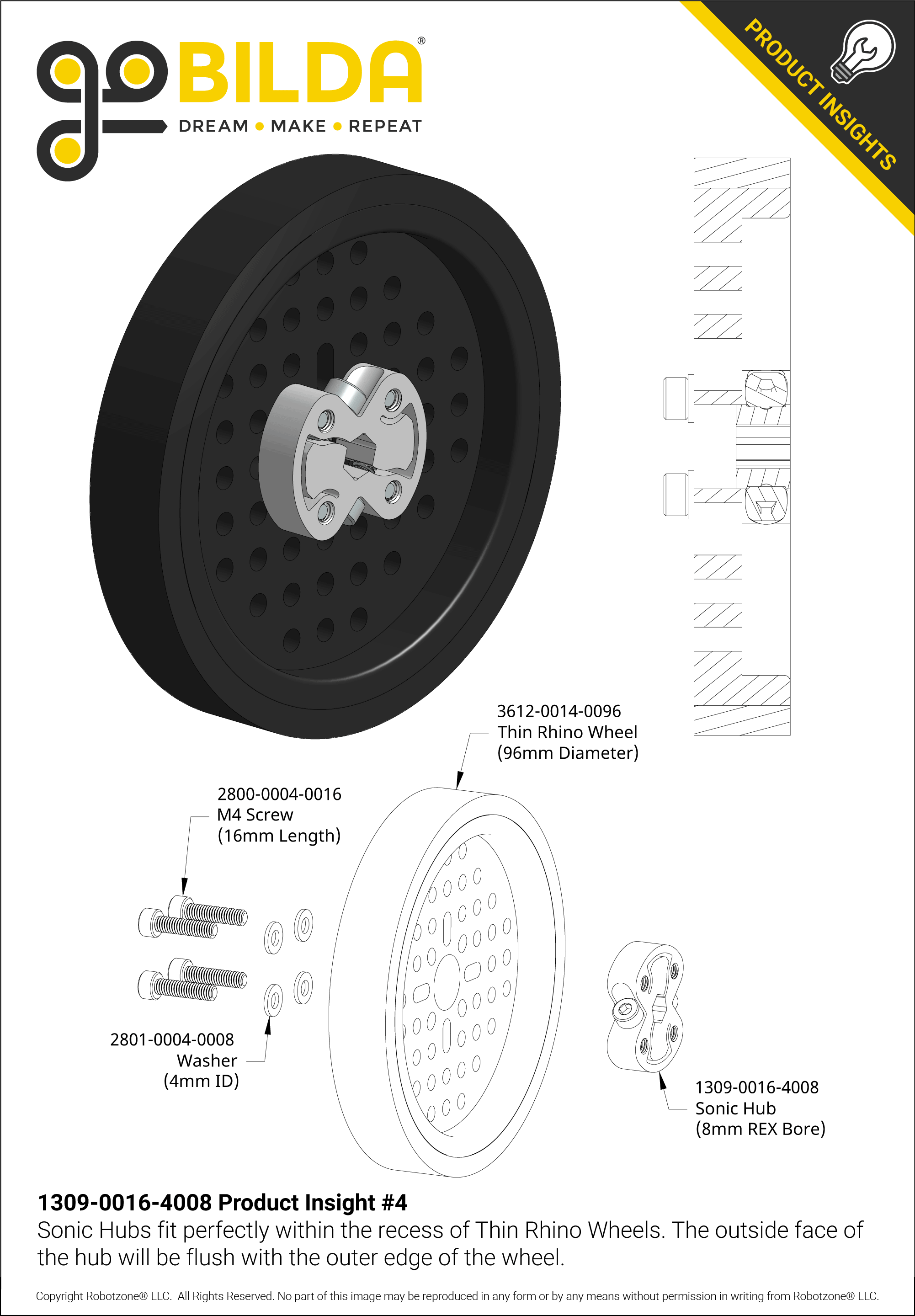 The goBILDA® ecosystem has many parts that bolt directly to this hub. That includes wheels, gears, sprockets, track sprockets, timing pulleys, round belt pulleys, winch pulleys, control arms, and more.