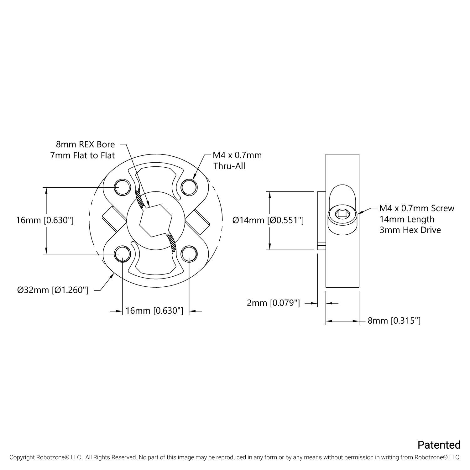 This hub allows you to mount components to an 8mm REX™ shaft. A "REX" shaft is part round and part hex. An 8mm REX™ shaft is 7mm flat-to-flat, like 7mm hex shafts. The difference is that the tips are precision ground to an 8mm diameter allowing it to fit in an 8mm bearing. The bore of this hub has enough clearance in the corners to accept most 7mm hex shafts.