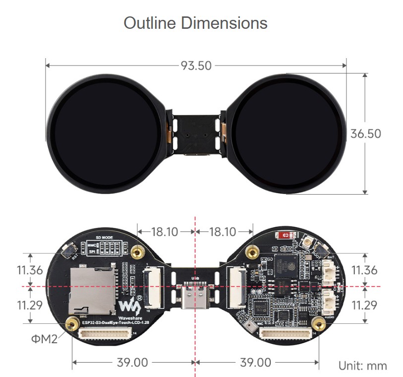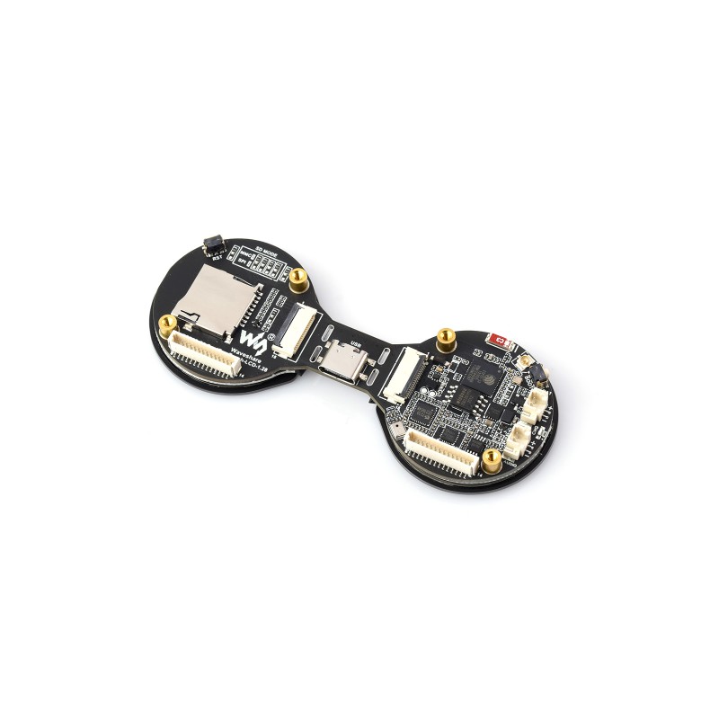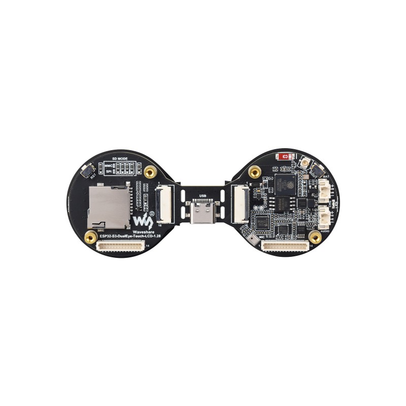 The ESP32-S3-DualEye-Touch-LCD-1.28 is an AIoT microcontroller development board based on ESP32-S3 with double eye LCD displays, designed for makers and electronics enthusiasts, supporting 2.4GHz Wi-Fi and Bluetooth BLE 5. It integrates high-capacity Flash and PSRAM, onboard dual 1.28inch LCD displays which can smoothly run GUI programs such as LVGL. Additionally, it also integrates a microphone, speaker header, Lithium battery recharge circuit, and reserves a TF card slot and DIY expansion connectors. It is suitable for the quick development based on ESP32-S3 such as HMI (Human-Machine Interface), double eye robotic agents, and AI voice-interactive toys. Whether you want to build a robot that can "wink", create an intelligent IoT Interface, design touch-controlled games, or develop futuristic wearable devices, this board is an ideal choice.