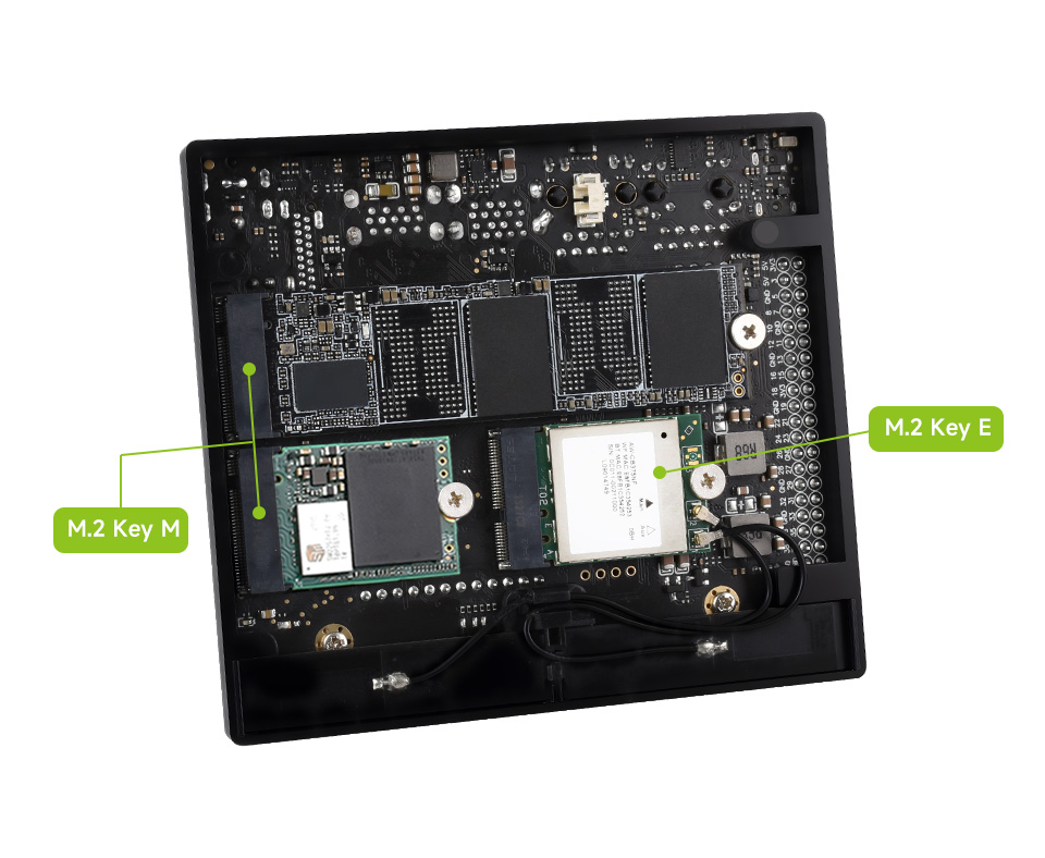 Onboard 2 × M.2 Key M ports for easy connecting Solid State Drives and 1 × M.2 Key E interface for connecting wireless NIC, which can reduce cable connection