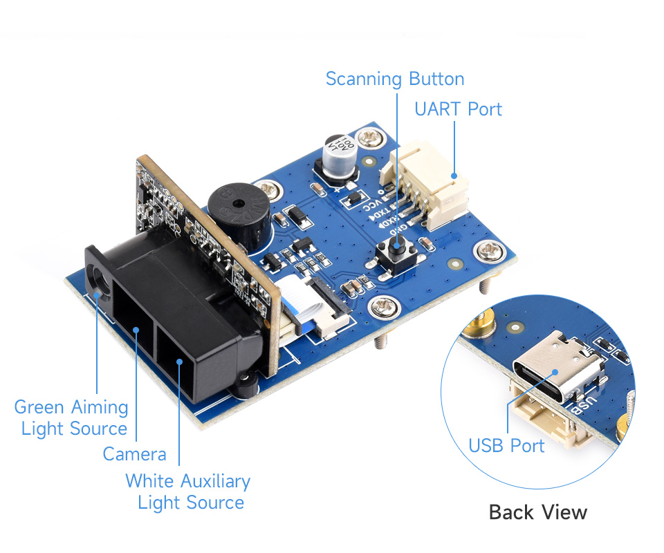 The Barcode Scanner Module (E) is a Barcode/2D code scanner module. By using the intelligent image recognition algorithm, it can decode 1D / 2D and DPM codes on paper or PCB boards quickly and accurately. It is compatible with multiple barcode formats including DotCode and DM, supports high accuracy, high speed, and high contrast barcode scanning. Onboard USB and UART interfaces allow direct connection to a computer or easy integration into embedded devices.