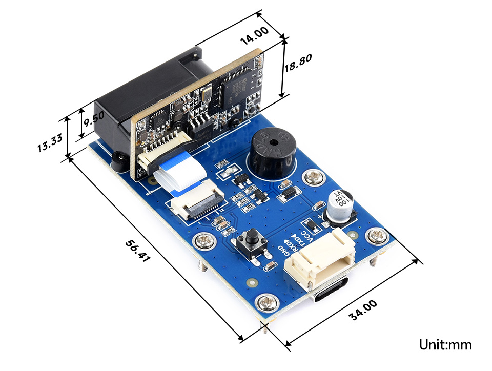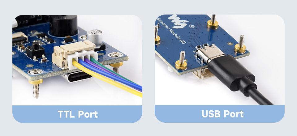 Equipped with TTL and USB interfaces. It can be configured with three output modes: USB virtual serial port, USB keyboard mode, and TTL serial port.