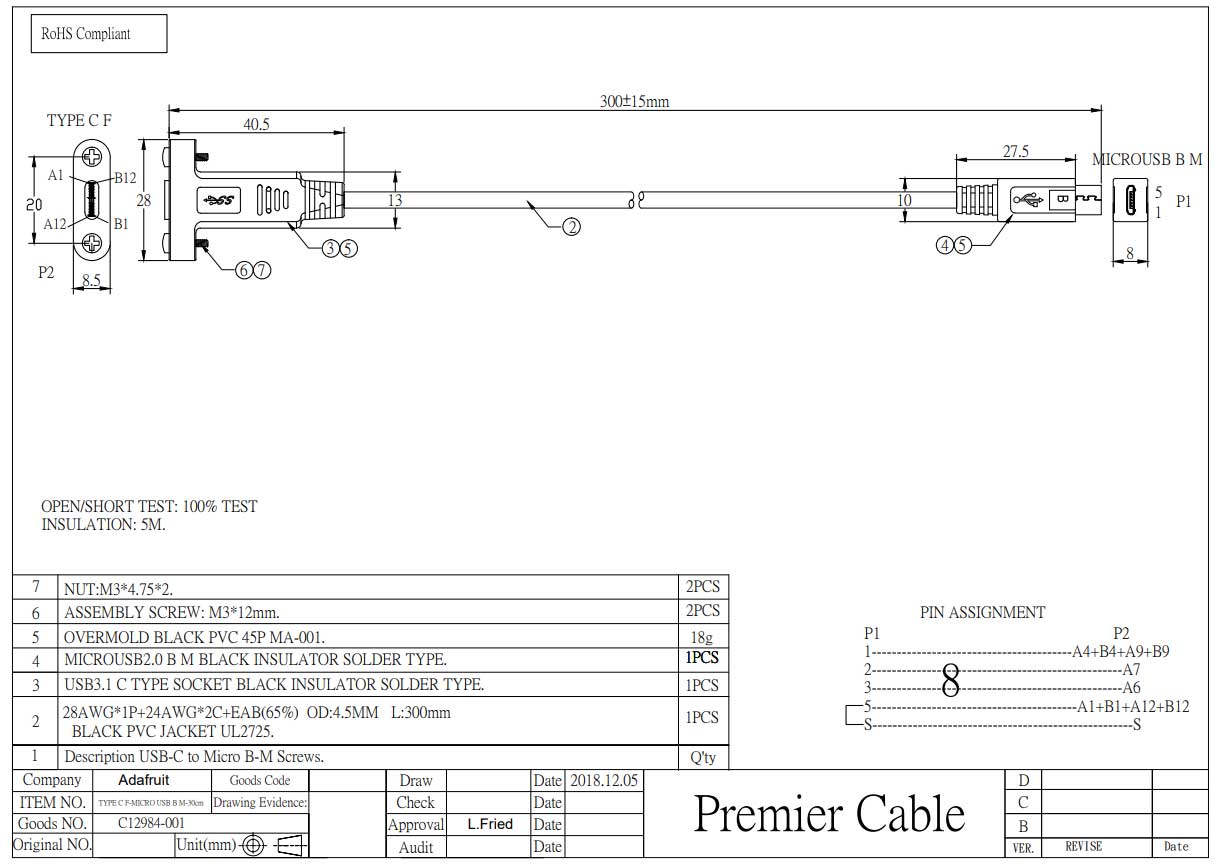 This panel mount cable will allow you to enclose a device that has a USB Micro B port, and also converts it to a modern USB C connector at the same time. Perfect for placing your project in a secure box! One end is a USB Micro B plug connector, and other is a USB C socket with special over-molding.